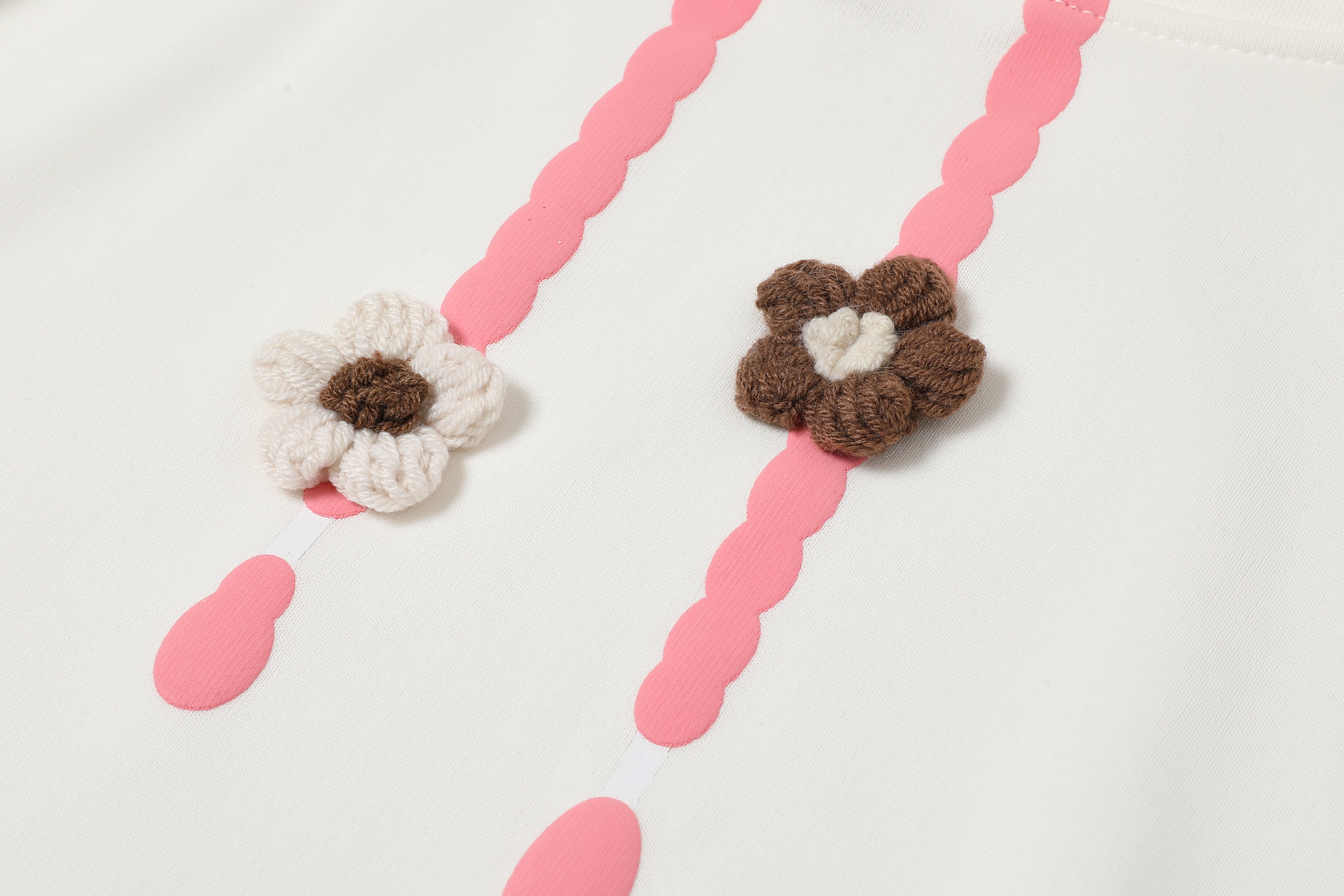 - Pink drawstrings with hanging flower charms in white and brown, adding a fun, unique twist.