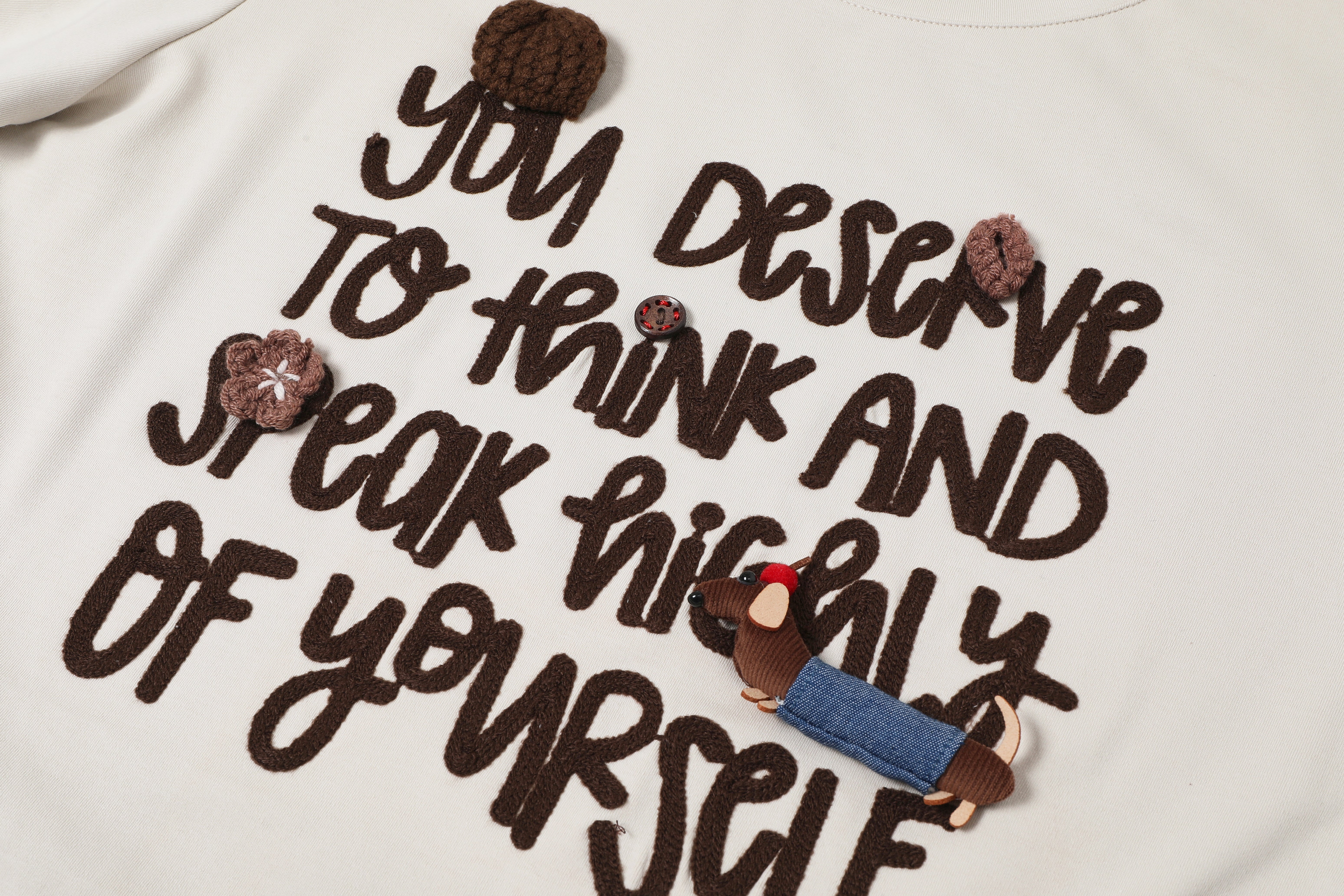 - Embroidered motivational quote "You Deserve To Think And Speak Highly Of Yourself" in playful script font for an uplifting message.