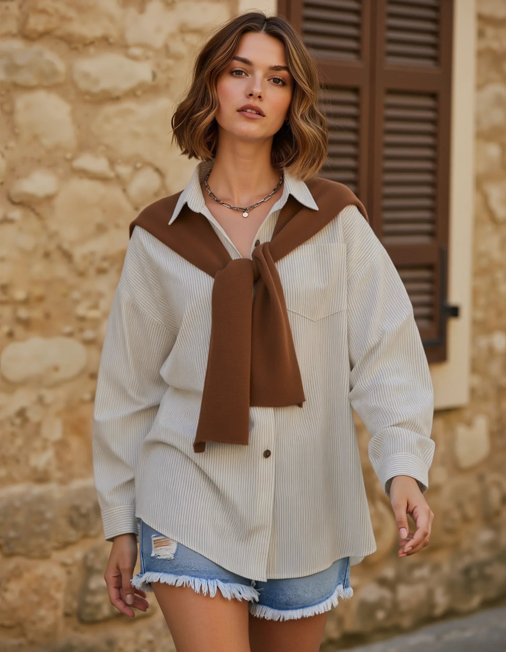 - Fine Pinstripe Pattern: Subtle vertical stripes in neutral tones for a classic, versatile look that pairs easily with various bottoms.