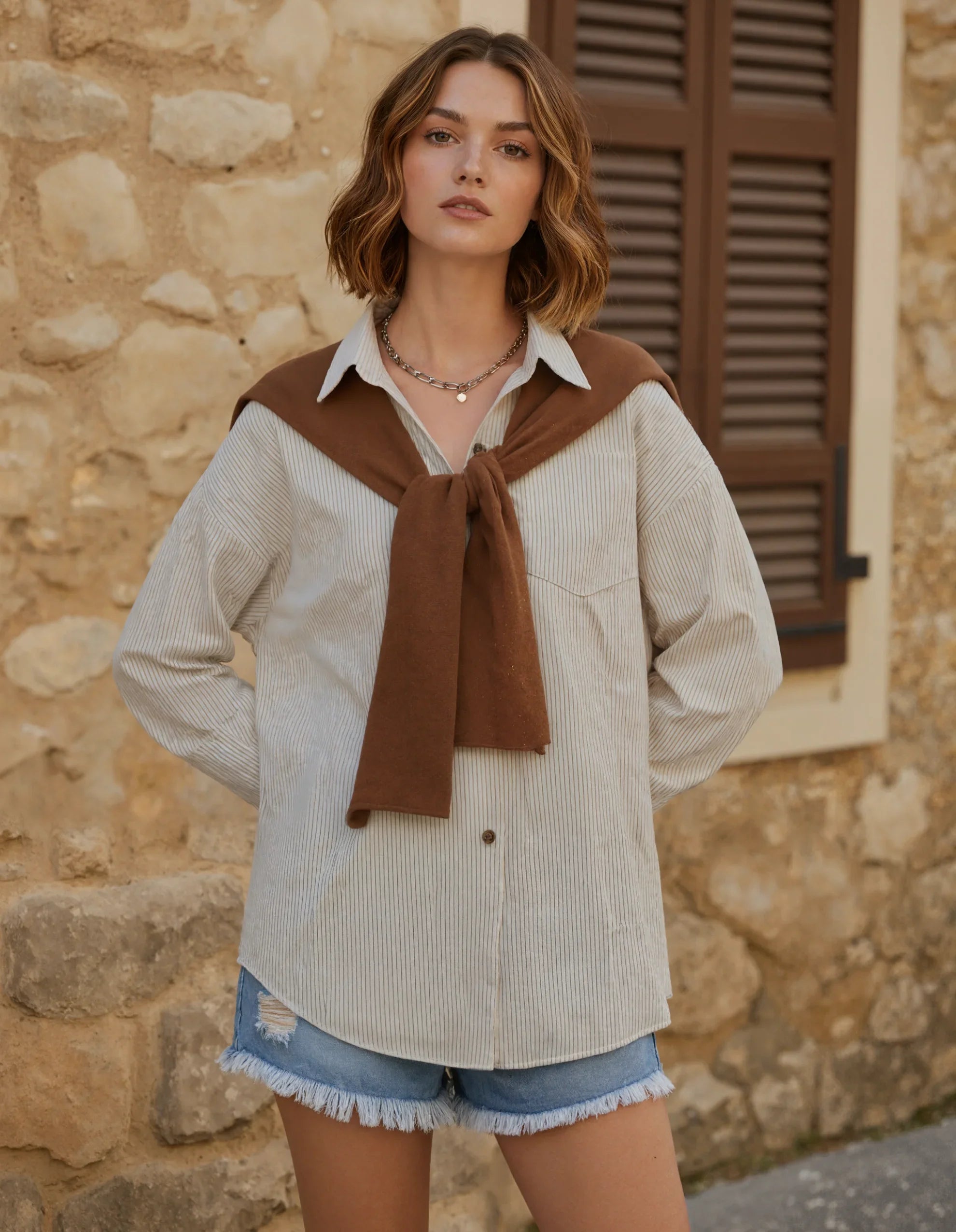 Preppy Striped Button Up with Tied Sweater
