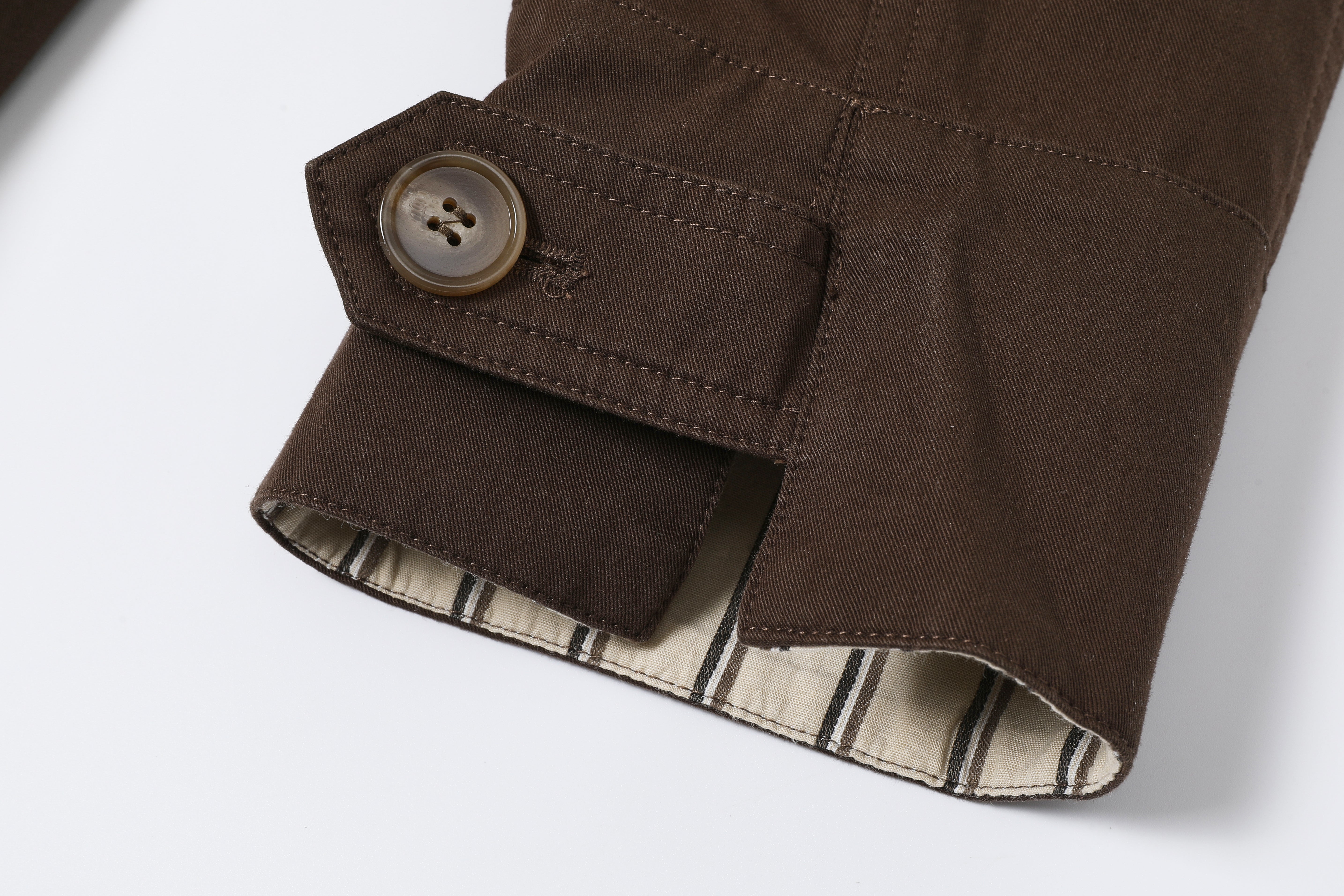 - Front button closure with tonal buttons for a clean, polished appearance.